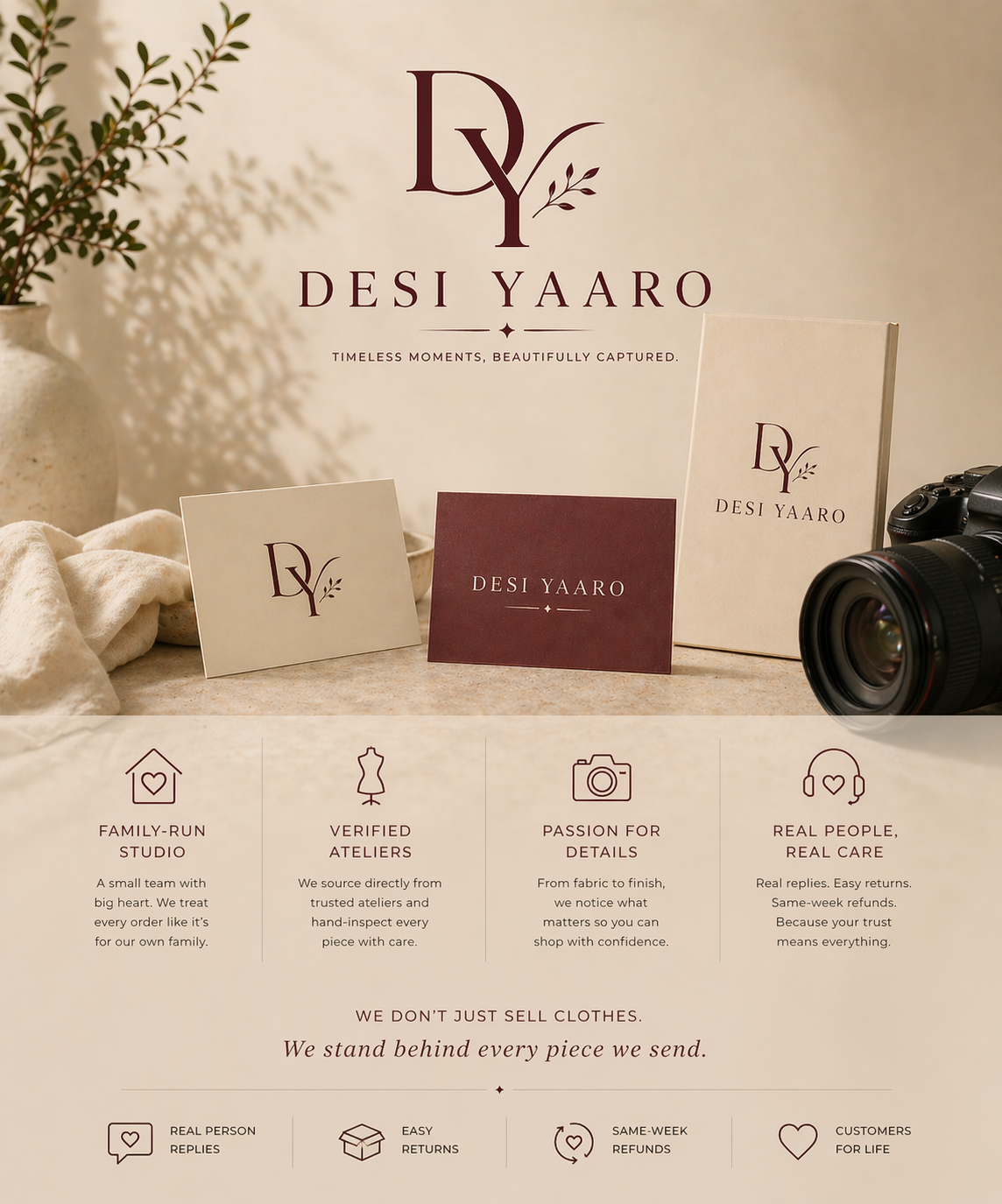 Desiyaaro is a small family-run studio of buyers, photographers, and customer-care specialists based in Irving, Texas. We source directly from verified ateliers and hand-inspect every piece — if a garment would not make it into our own closet, it does not make it onto the site.