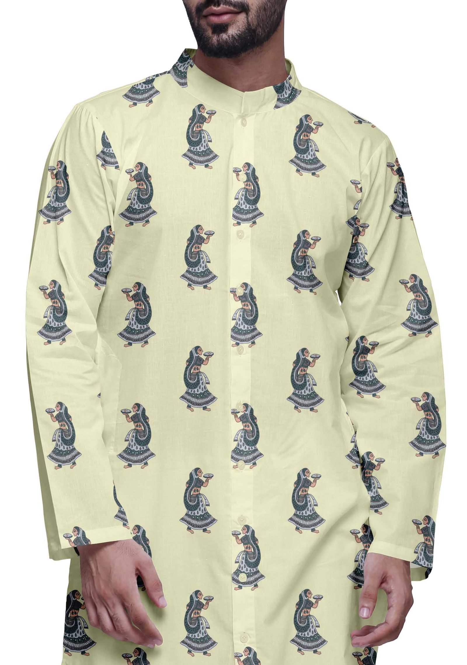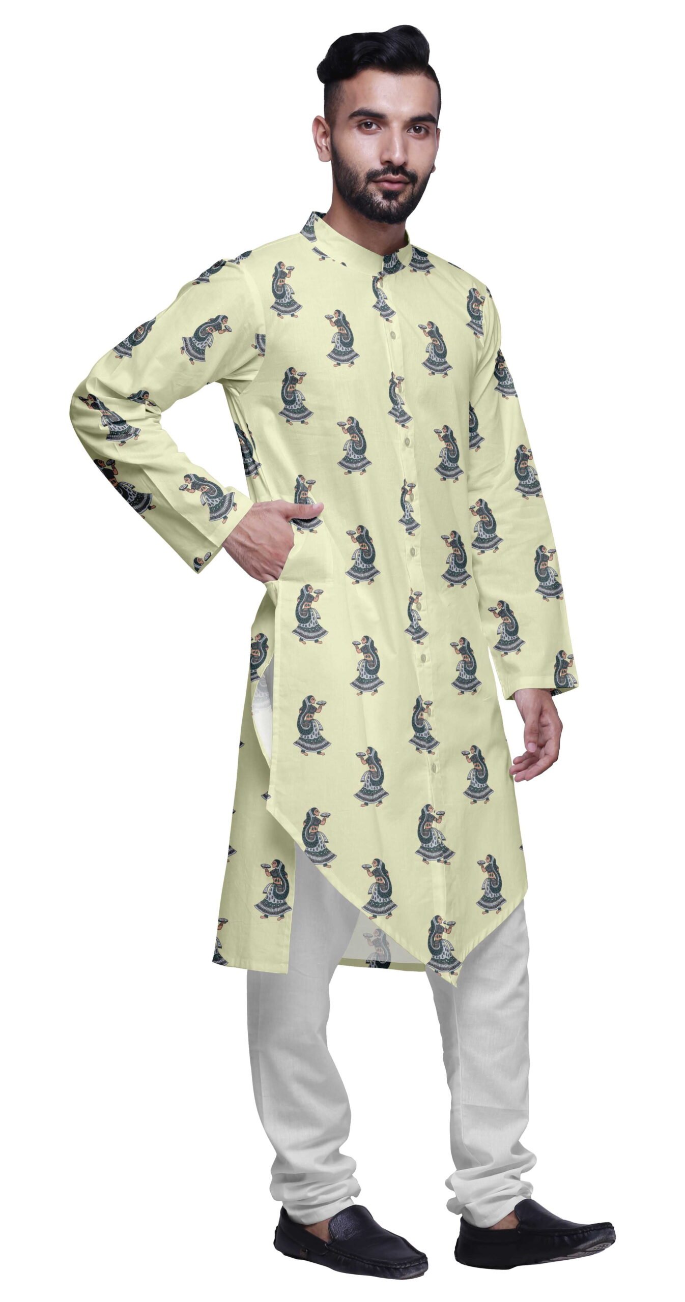 Printed asymmetrical readymade kurta with churidar Pajama set in rayon designed with button down. The kurta features full sleeves and mandarin collar.Material: Rayon Sale For: 1 Set (Includes Kurta With Churidar Pajama)Kurta Length: 42 Inches (Approx) | Churidar Pajama Length : 50 Inches (Approx)Model Height: 177 cm (Approx)Collar Type: Mandarin Length Type: Below Knee LengthSleeve Type: Full Sleeve Pattern-style: Printed. Care:Machine Or Hand-Wash in Cold or Warm with All Purpose Detergent, Line Dry In Shade, Do Not Bleach. SIZE INFORMATION: Please refer to our size chart before making the purchase. If your size is in between two sizes, we recommend that you choose a larger size.➊ Size S : Chest – 38 Inches; Length-42 Inches; Shoulder- 17 Inches; Sleeve- 24 Inches ➋ Size M : Chest – 40 Inches; Length-42.5 Inches; Shoulder- 17.5 Inches; Sleeve- 24.5 Inches ➌ Size L: Chest – 42 Inches; Length-43 Inches; Shoulder- 18 Inches; Sleeve- 25 Inches ➍ Size XL : Chest – 44 Inches; Length-43.5 Inches; Shoulder- 18.5 Inches; Sleeve- 25.5 Inches ➎ Size 2XL : Chest – 46 Inches; Length-44 Inches; Shoulder- 19 Inches; Sleeve- 26 Inches ➏ Size 3XL : Chest – 48 Inches; Length-44.5 Inches; Shoulder- 19.5 Inches; Sleeve- 26.5 Inches ➐ Size 4XL : Chest – 50 Inches; Length-45 Inches; Shoulder- 19.5 Inches; Sleeve- 27 Inches
