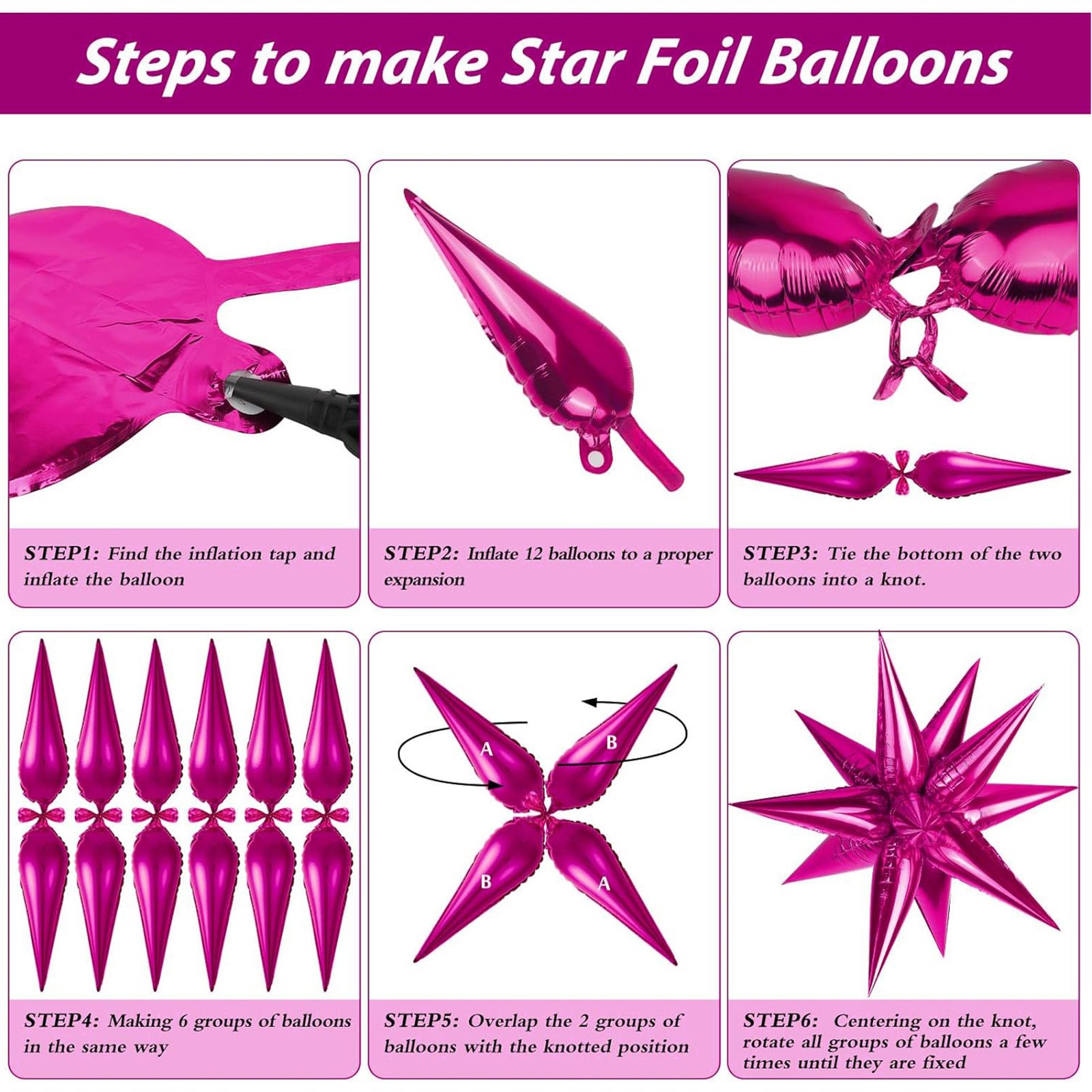 Tips: Fully automatic sealing, not easy to leak. It can last for weeks after being inflated. Do not overfill the fuchsia star balloon to avoid sunburn, overheating, sharp objects and excessive friction. Strong winds or over-clapping may cause the balloon to burst.