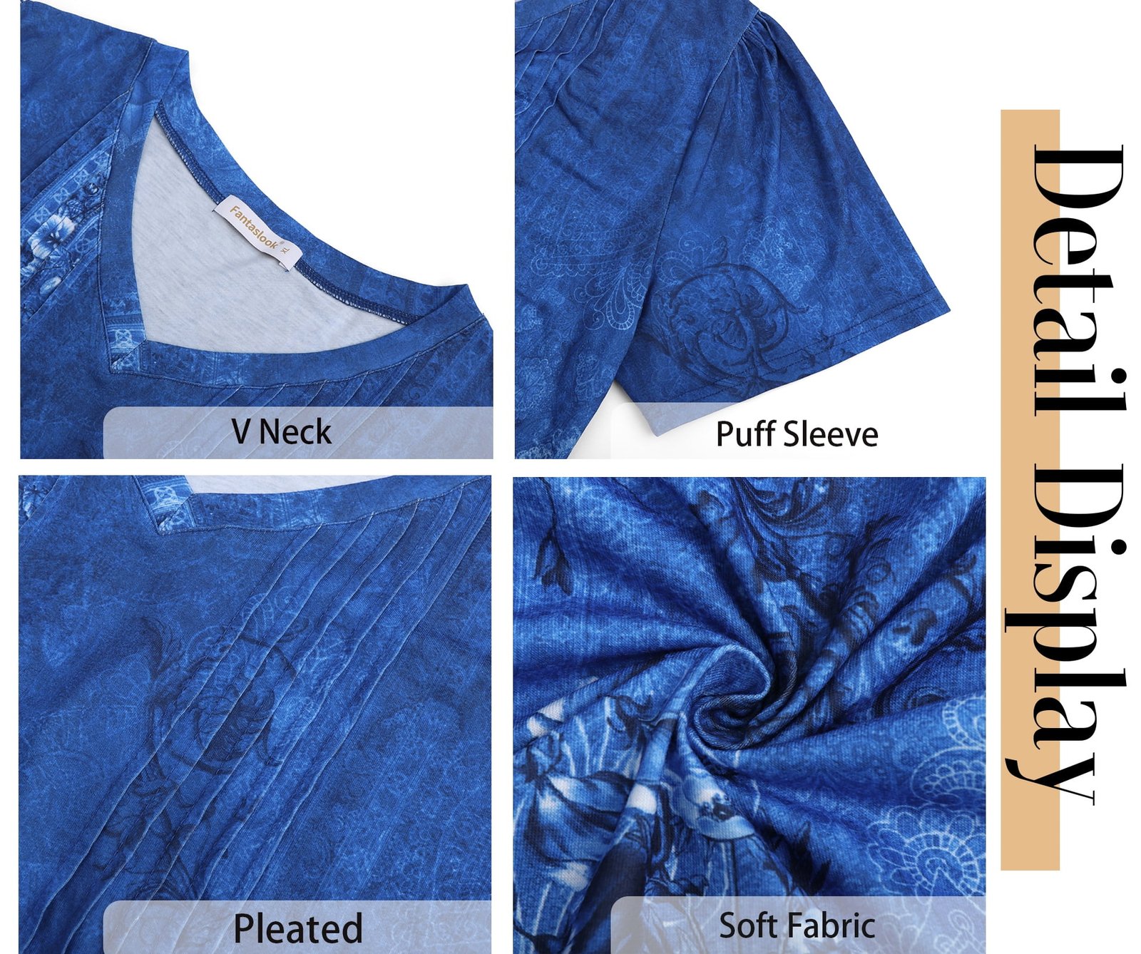 🌸【Design】- Flattering boho design for every body shape, womens tops featuring a classic v neck and elegant pleated detailing, puff short sleeve shirts, pleated v neck t shirts, floral blouses, bohemian tunic tops, fashion summer tops, business work tops, flattering womens clothes, elegant flowy tee shirts, dressy tops for women combines timeless charm with modern style. Womens shirts loose fit and curved hem provide a relaxed and comfortable feel also flatter your figure by subtly hiding the tummy area. Designed with slimming front pleats, womens blouses enhances your feminine silhouette, making it a perfect choice for any body shape. Effortlessly versatile, making summer shirts a go-to piece for both casual outings and dressier occasions.