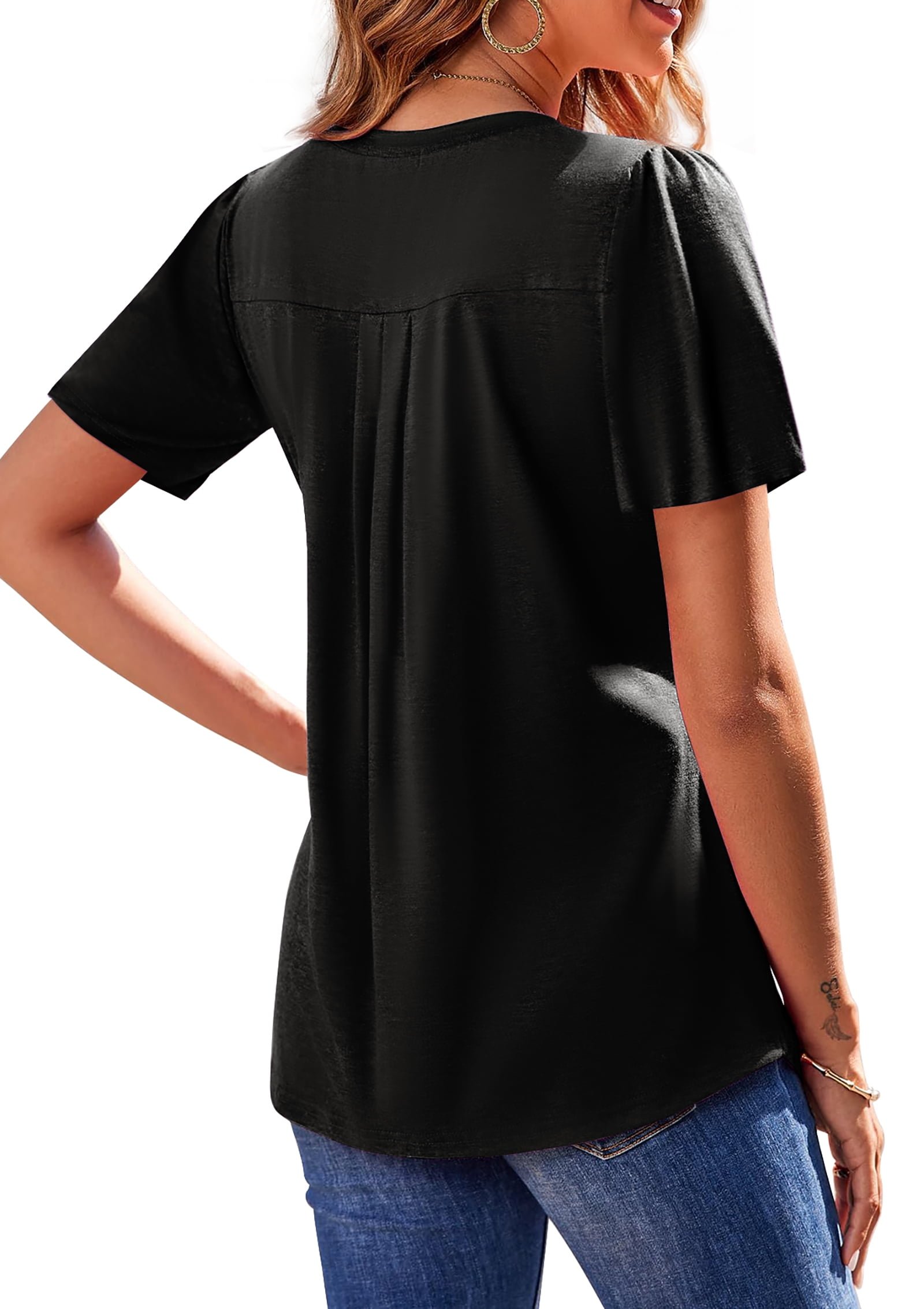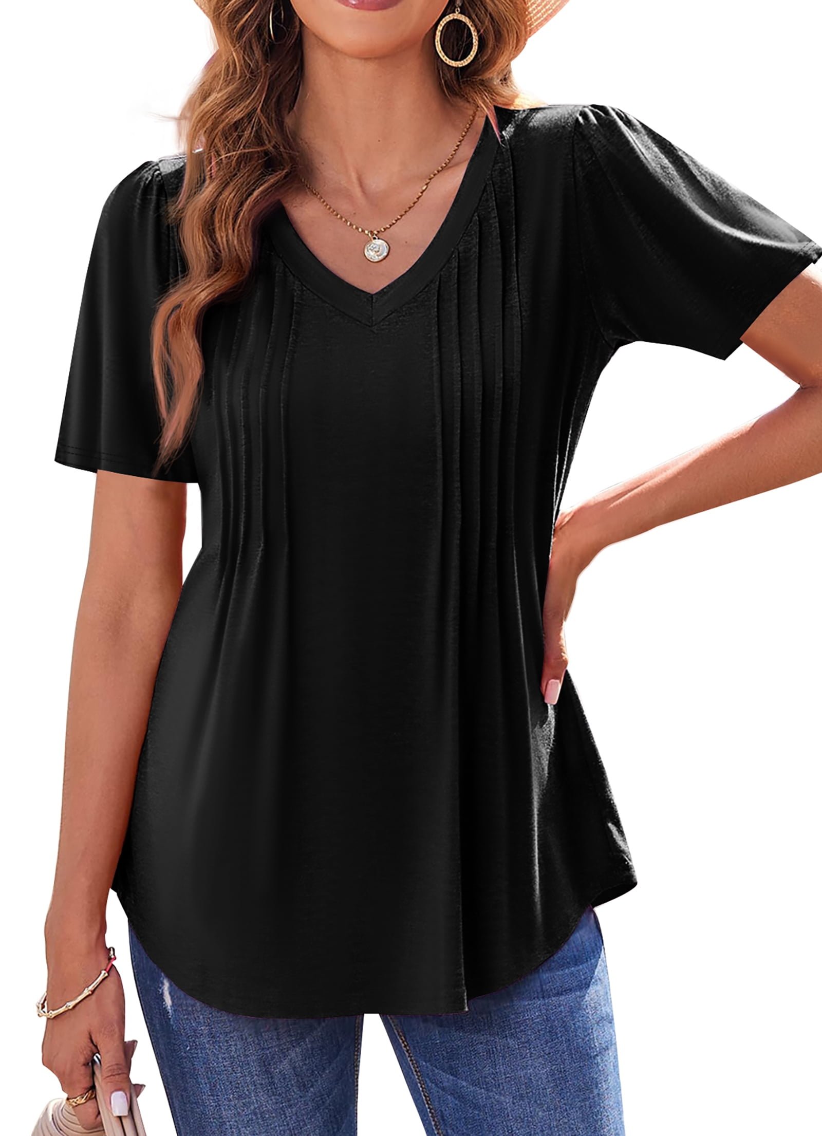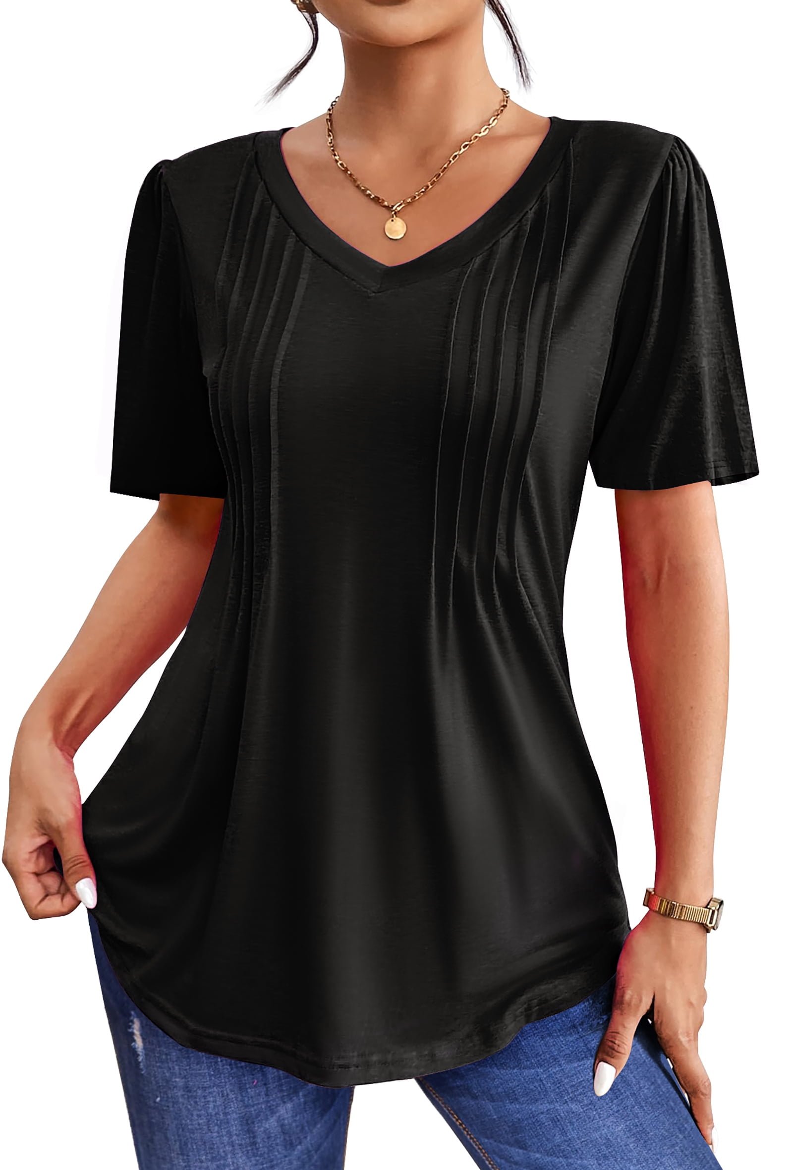Fantaslook Blouses for Women Dressy Casual V Neck Pleated Tunic Tops Summer Short Sleeve Boho Shirts