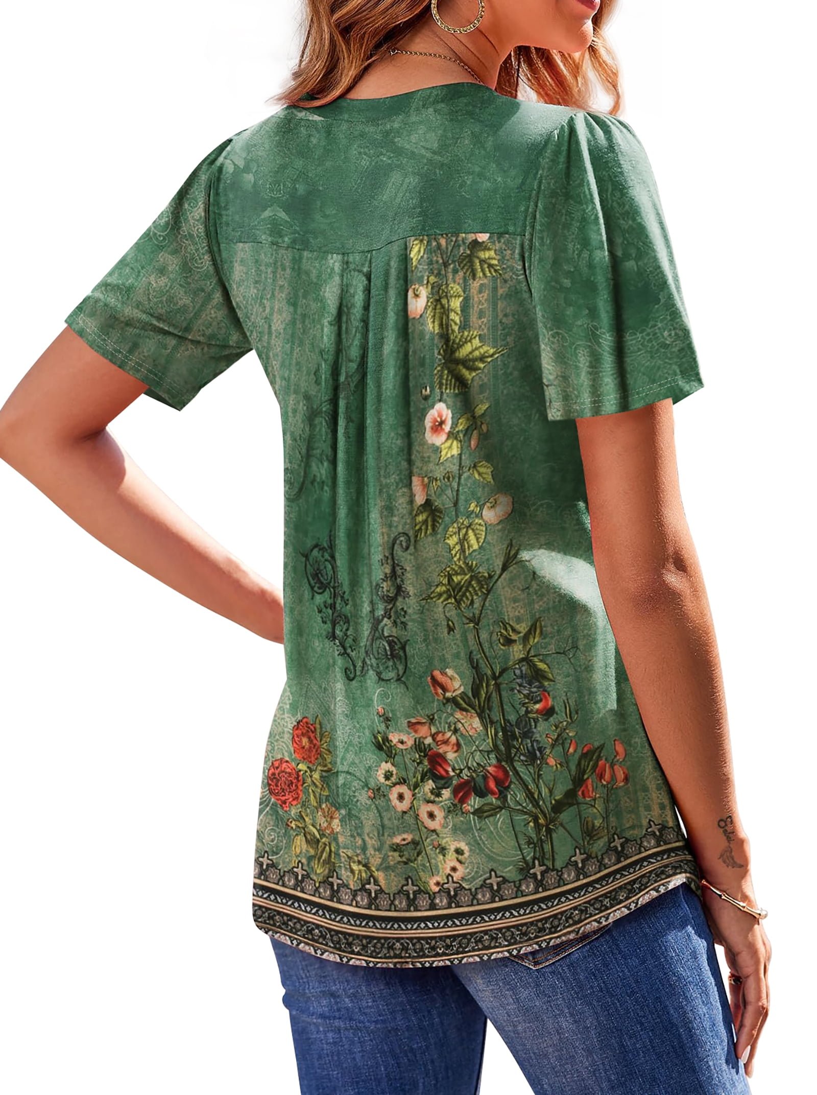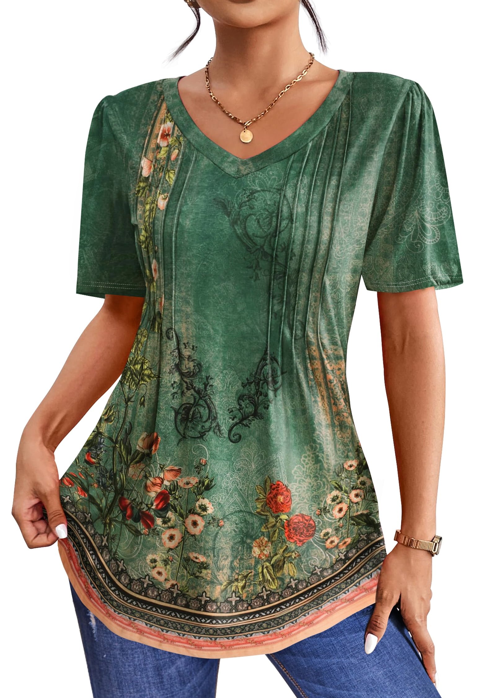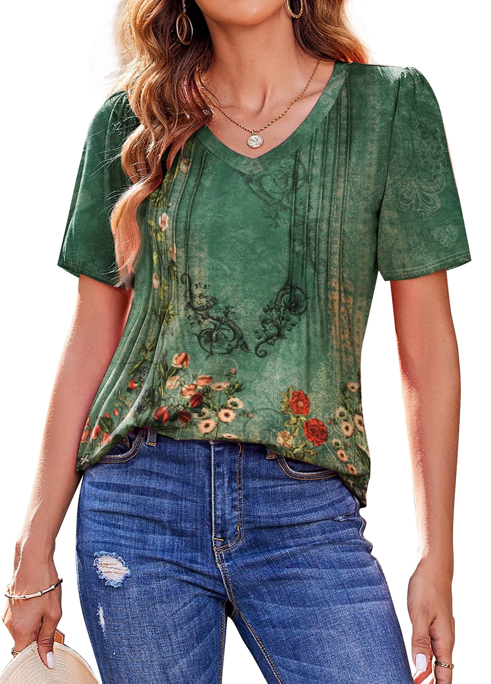 • 🌸【Design】- Flattering boho design for every body shape, womens tops featuring a classic v neck and elegant pleated detailing, puff short sleeve shirts, pleated v neck t shirts, floral blouses, bohemian tunic tops, fashion summer tops, business work tops, flattering womens clothes, elegant flowy tee shirts, dressy tops for women combines timeless charm with modern style. Womens shirts loose fit and curved hem provide a relaxed and comfortable feel also flatter your figure by subtly hiding the tummy area. Designed with slimming front pleats, womens blouses enhances your feminine silhouette, making it a perfect choice for any body shape. Effortlessly versatile, making summer shirts a go-to piece for both casual outings and dressier occasions.