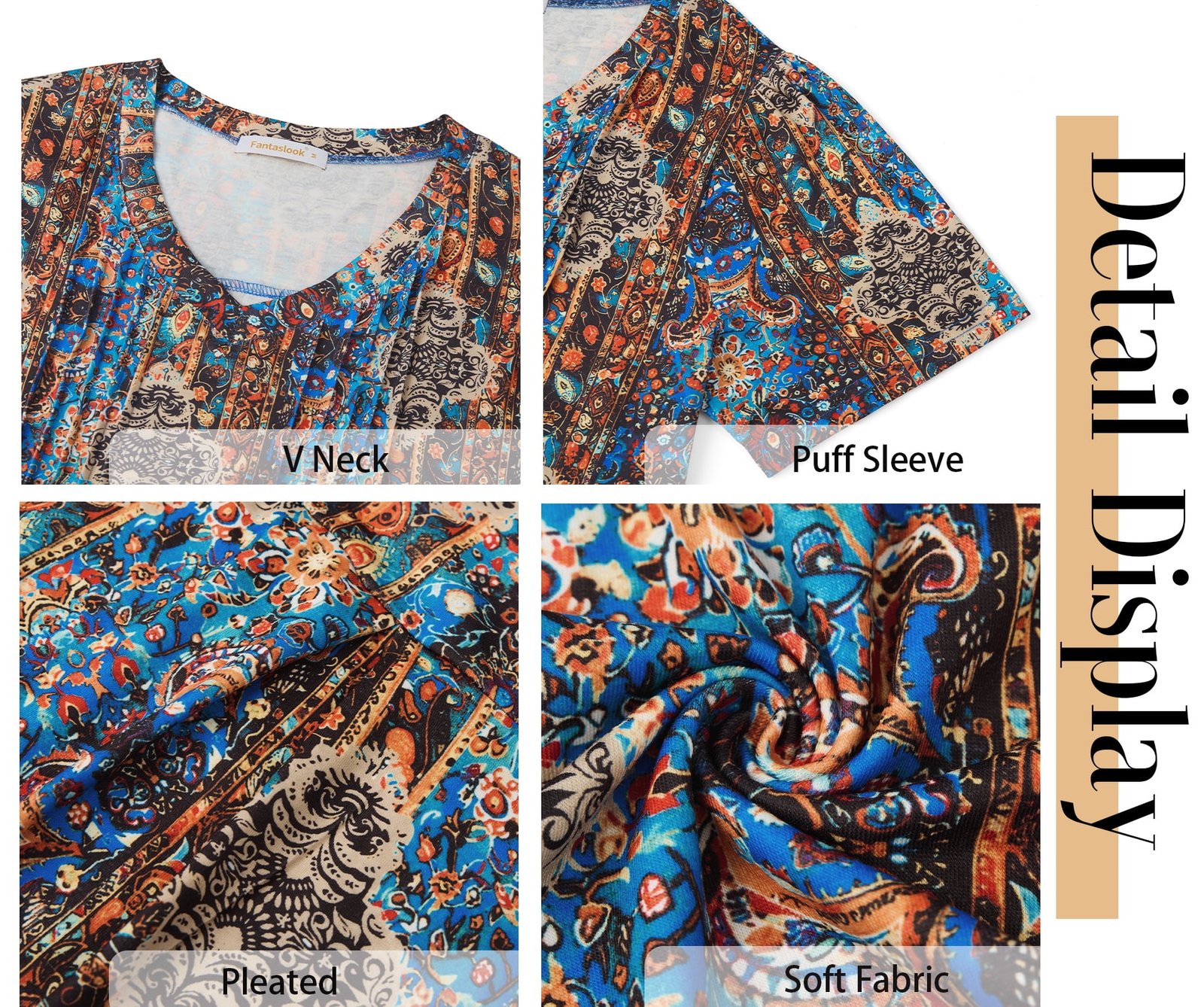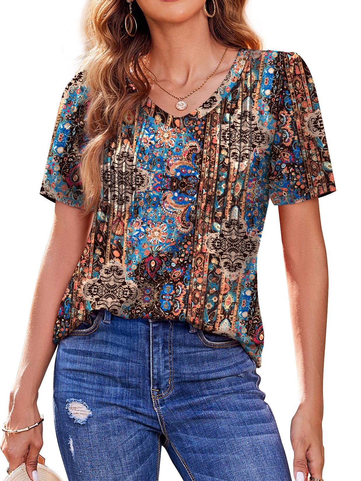 🌸【Design】- Flattering boho design for every body shape, womens tops featuring a classic v neck and elegant pleated detailing, puff short sleeve shirts, pleated v neck t shirts, floral blouses, bohemian tunic tops, fashion summer tops, business work tops, flattering womens clothes, elegant flowy tee shirts, dressy tops for women combines timeless charm with modern style. Womens shirts loose fit and curved hem provide a relaxed and comfortable feel also flatter your figure by subtly hiding the tummy area. Designed with slimming front pleats, womens blouses enhances your feminine silhouette, making it a perfect choice for any body shape. Effortlessly versatile, making summer shirts a go-to piece for both casual outings and dressier occasions.