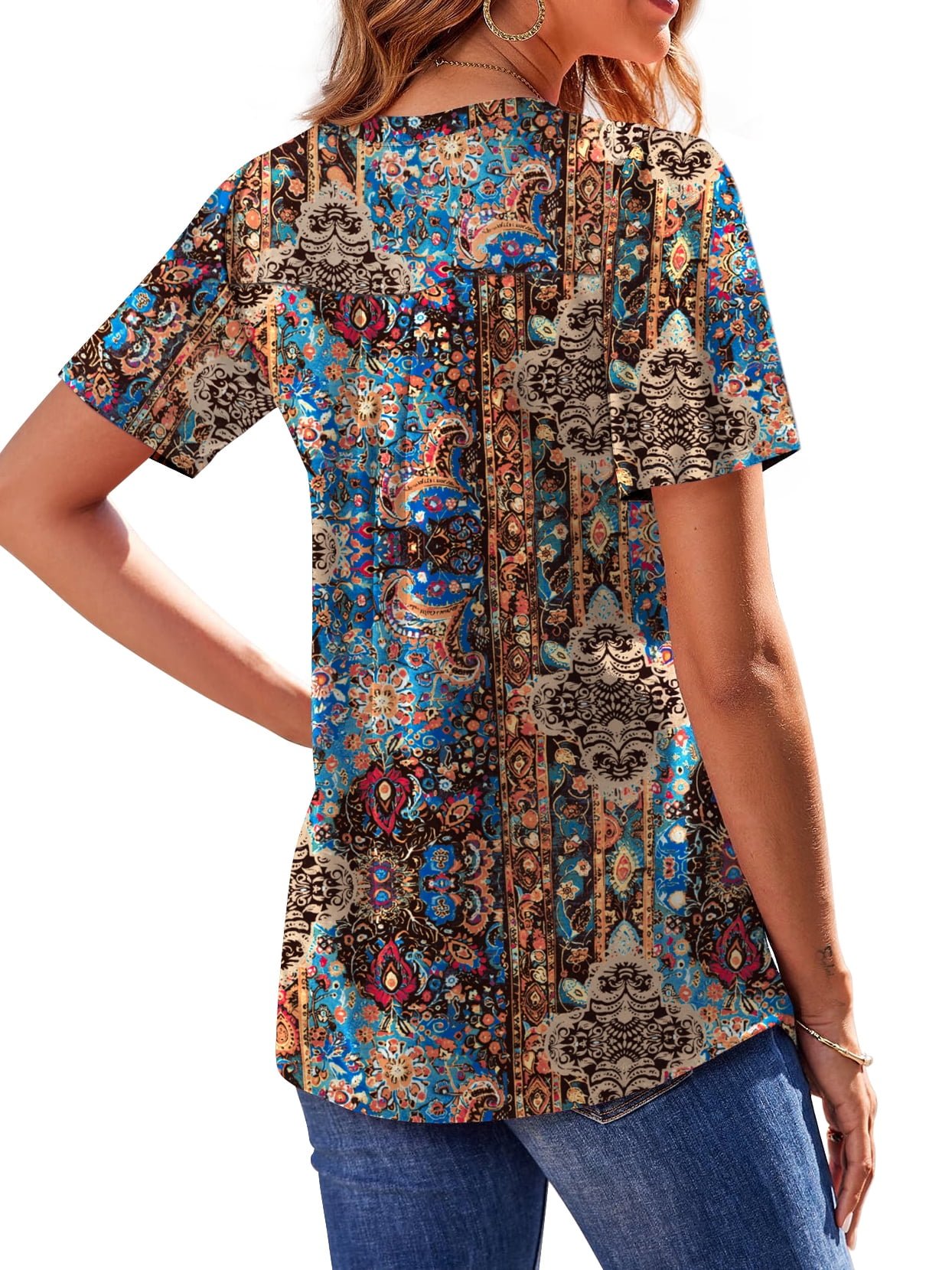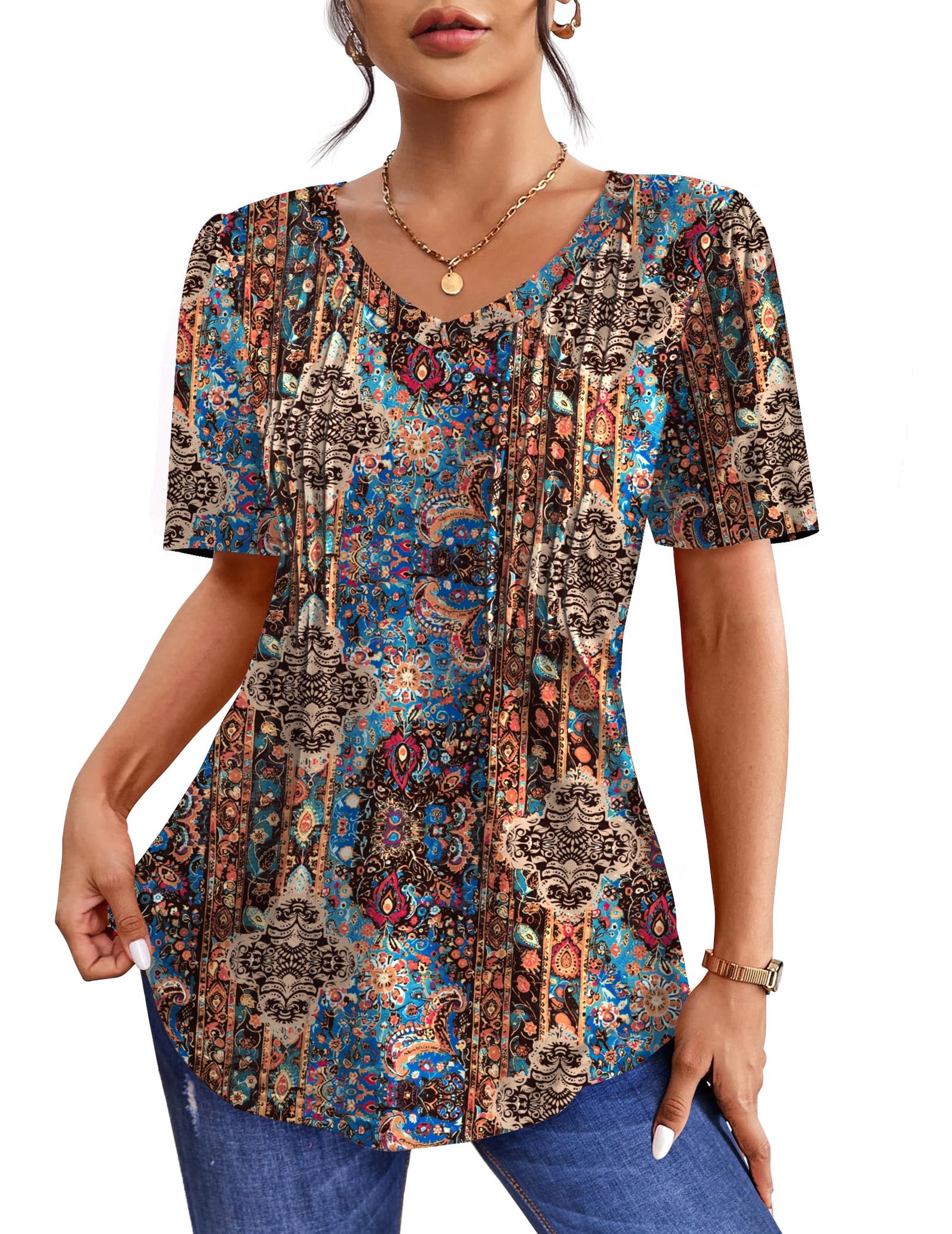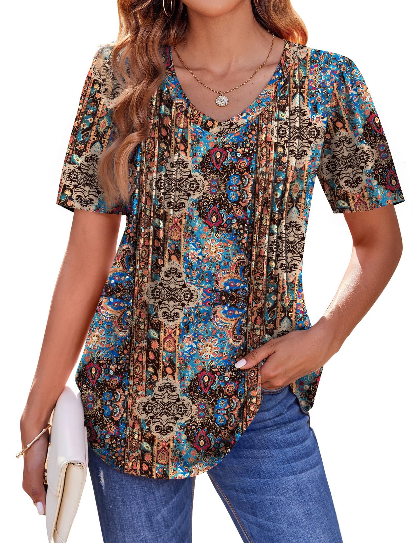 Womens blouses dressy casual is designed with a flattering v neck and delicate pleated, boho floral tops, tunic tops loose fit dressy style, womens shirts drapes beautifully to provide a relaxed yet chic fit. Womens tops short sleeves ensure you stay cool and comfortable during warmer months, v neck shirts for women making it an ideal choice for casual outings, beach days, or a laid-back dinner. The summer blouses timeless boho inspired design adds a touch of effortless elegance to any outfit, while the tunic cut offers ample coverage, dressy tops for women allowing you to pair it with jeans, leggings, or skirts for an effortlessly stylish look and elevate your summer wardrobe.