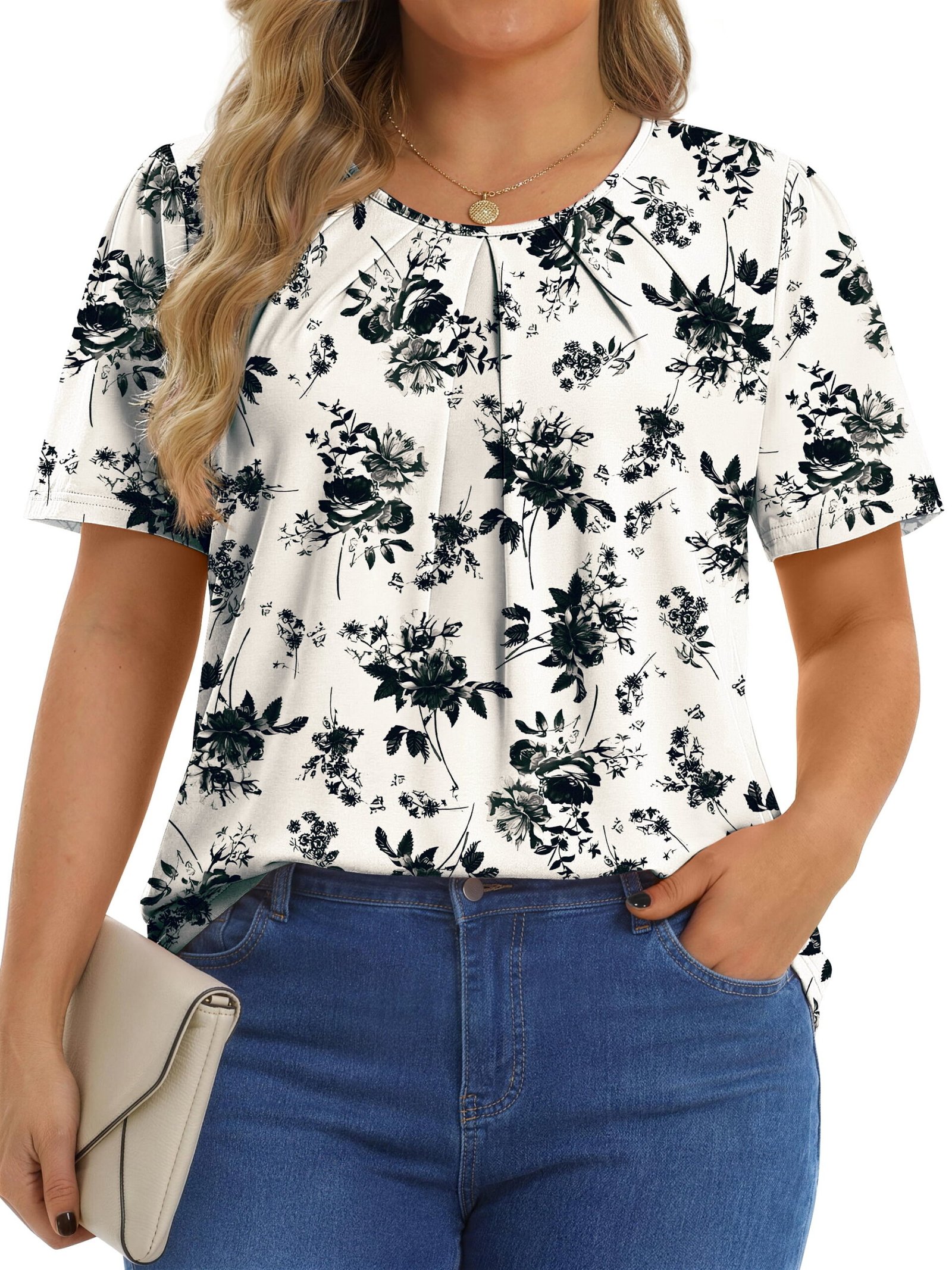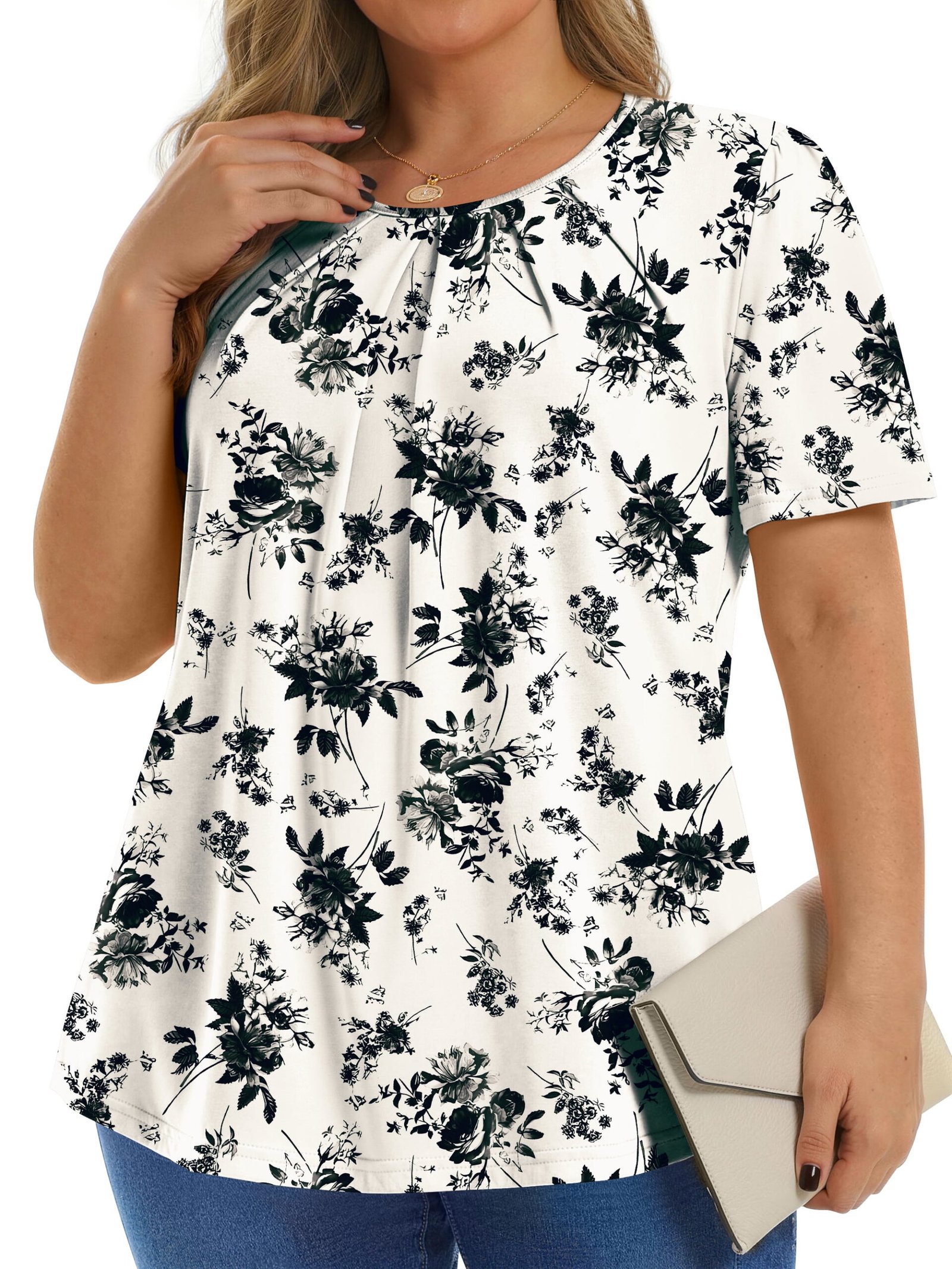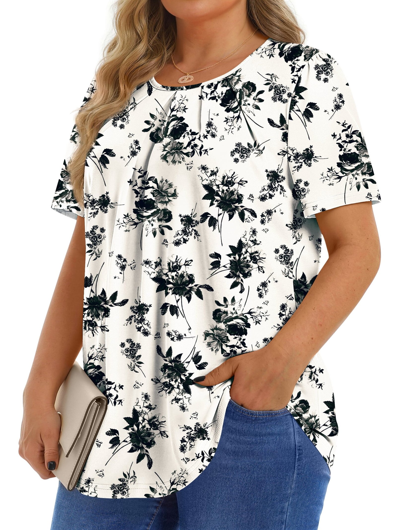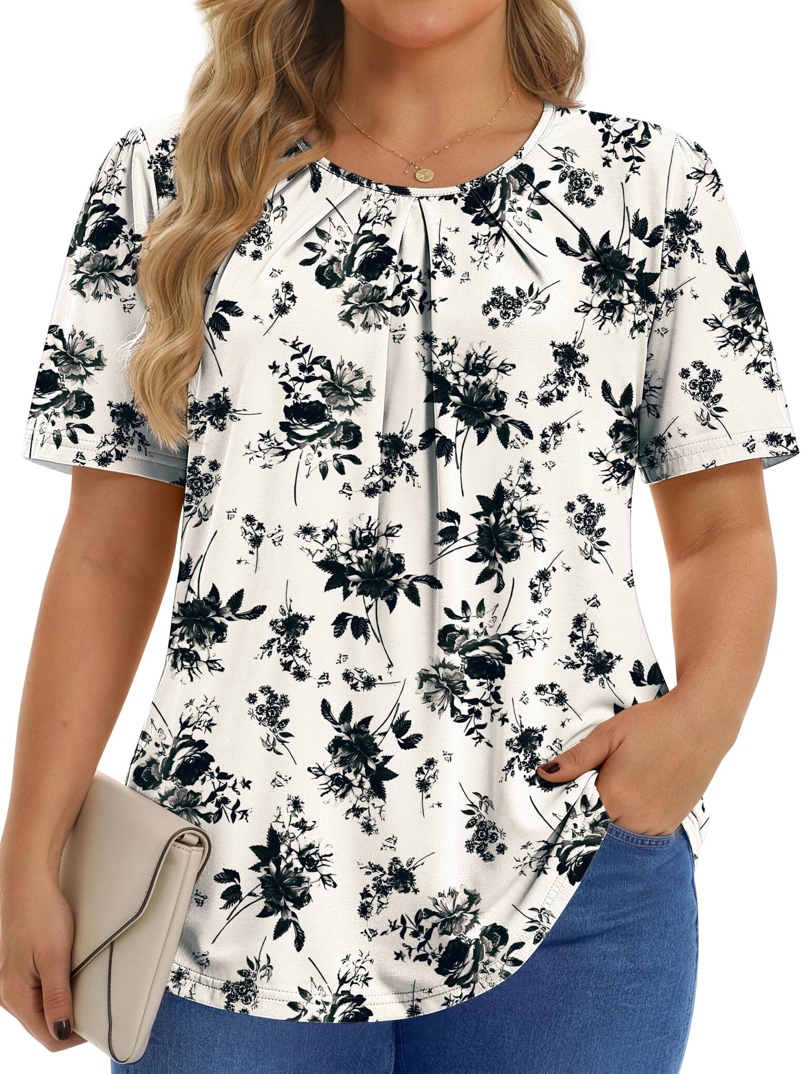Womens tops features crew neck, short sleeve, casual tunic tops, pleated floral shirts, loose fit style. Dressy Blouses for Women crafted with a delicate balance of elegance and modern flair, Pleated short sleeve tunic tops redefine casual chic. The gentle pleats accentuate the graceful flow of the fabric, offering a flattering silhouette that complements any body type. Designed for versatility, these blouses effortlessly transition from day to evening wear, whether you’re attending a casual outing or a formal gathering. It is a basic floral tops to add to your wardrobe in summer, offering a loose fit and short sleeves for a relaxed feel.