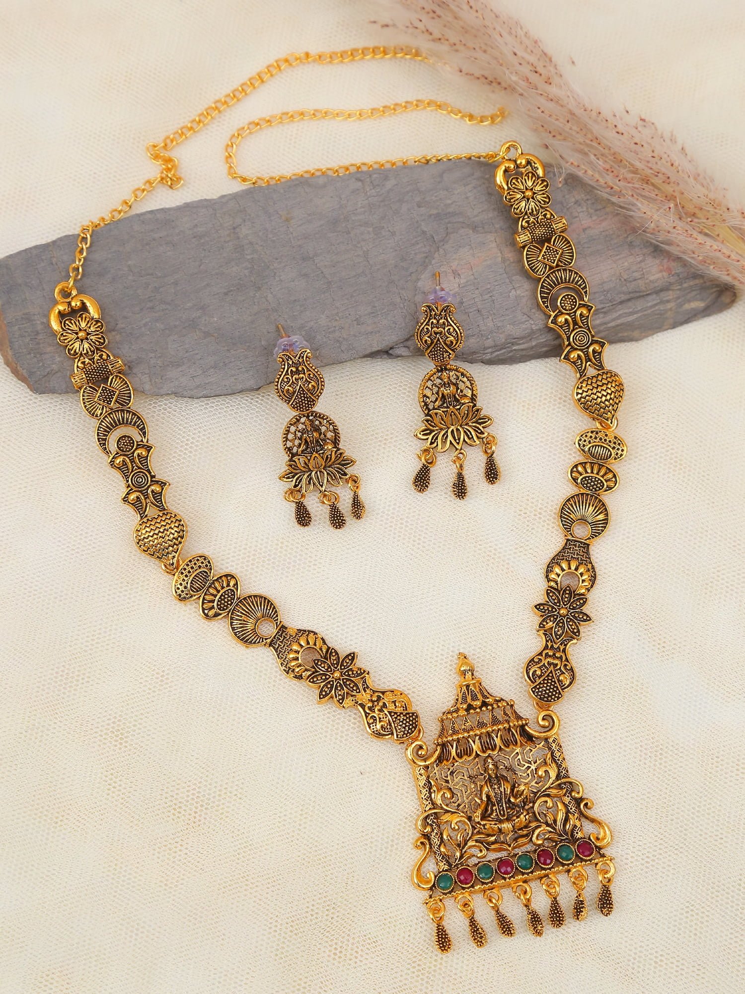 Gold-Plated Traditional Temple Kemp Goddess Laxmi Square Pendant Necklace & Earring Sets