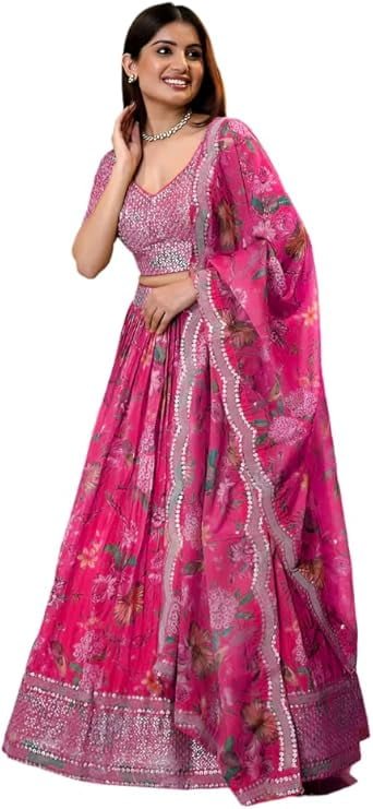 - Description : Blouse Fabric :- Organza || Lehenga :- Organza || Inner :- Satin || Front Neck : Sweetheart Neck || Back Neck : Round Neck || Dupatta :- Organza || Work :- Floral Print & Sequins Embroidered Work || Dupatta Length :- 2.25 MTR || Lehenga Flair :- 3.5 MTR || Size :- Max up to 46″ Inches || Style :- Designer Lengha Choli Suits || Type :- Ready to Wear ||