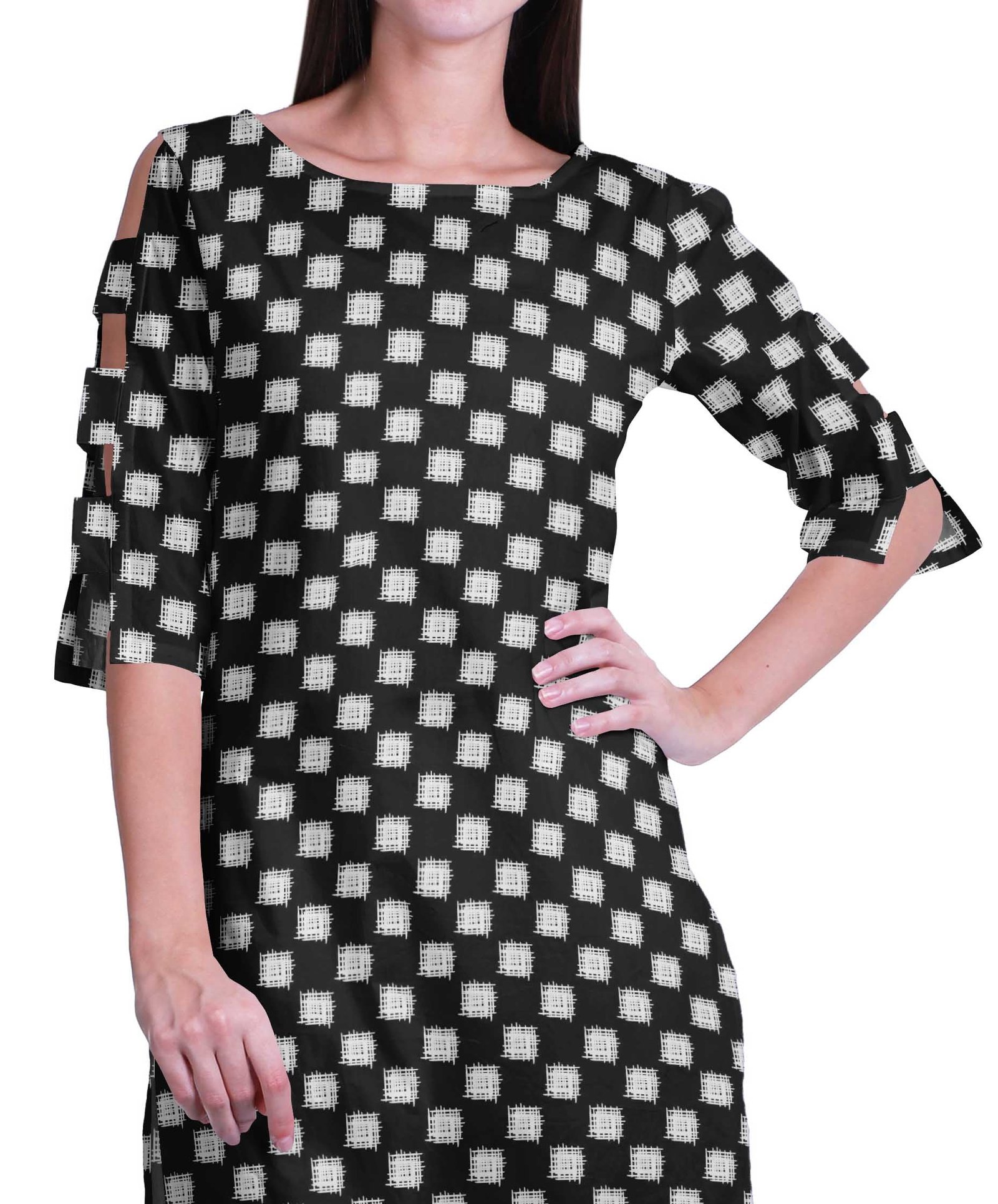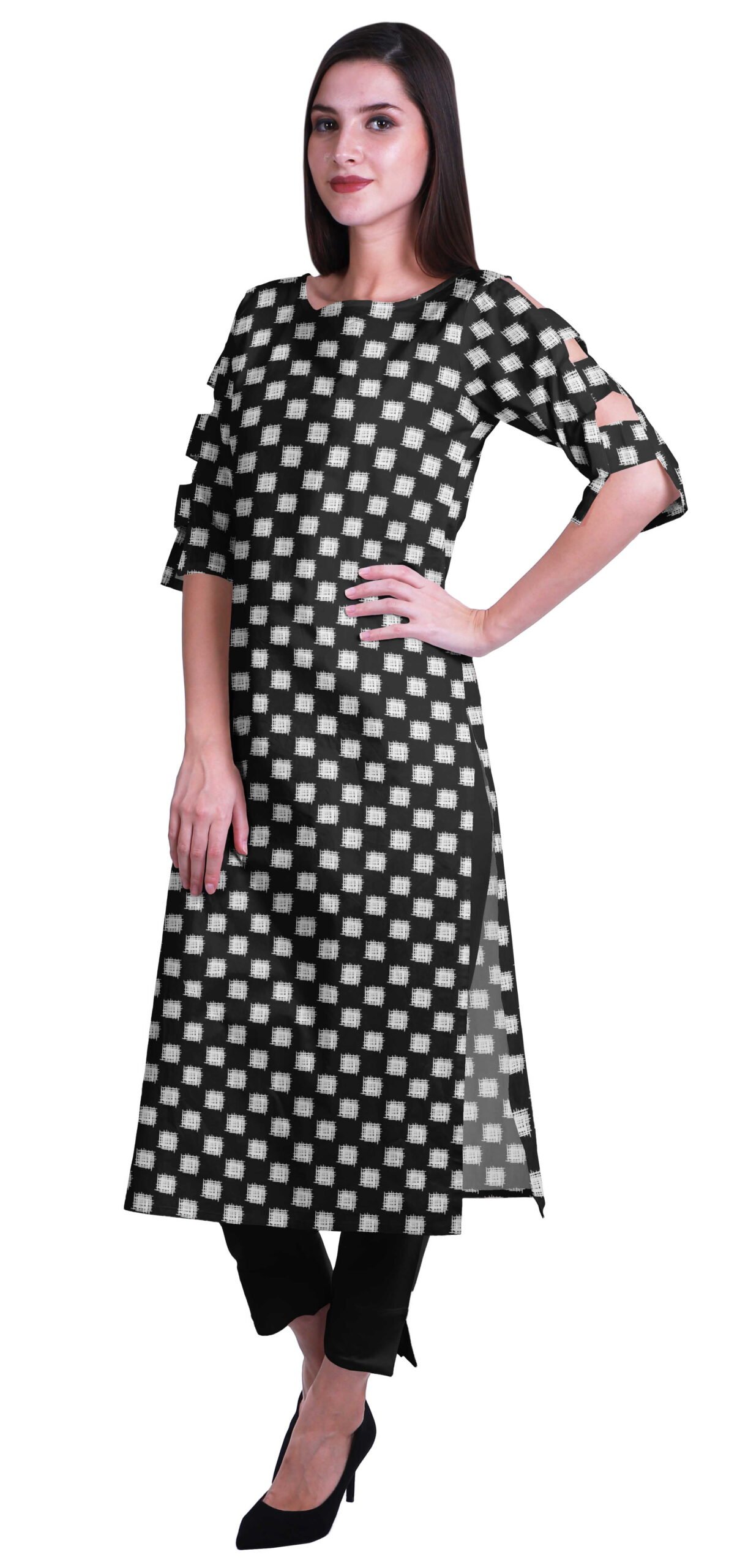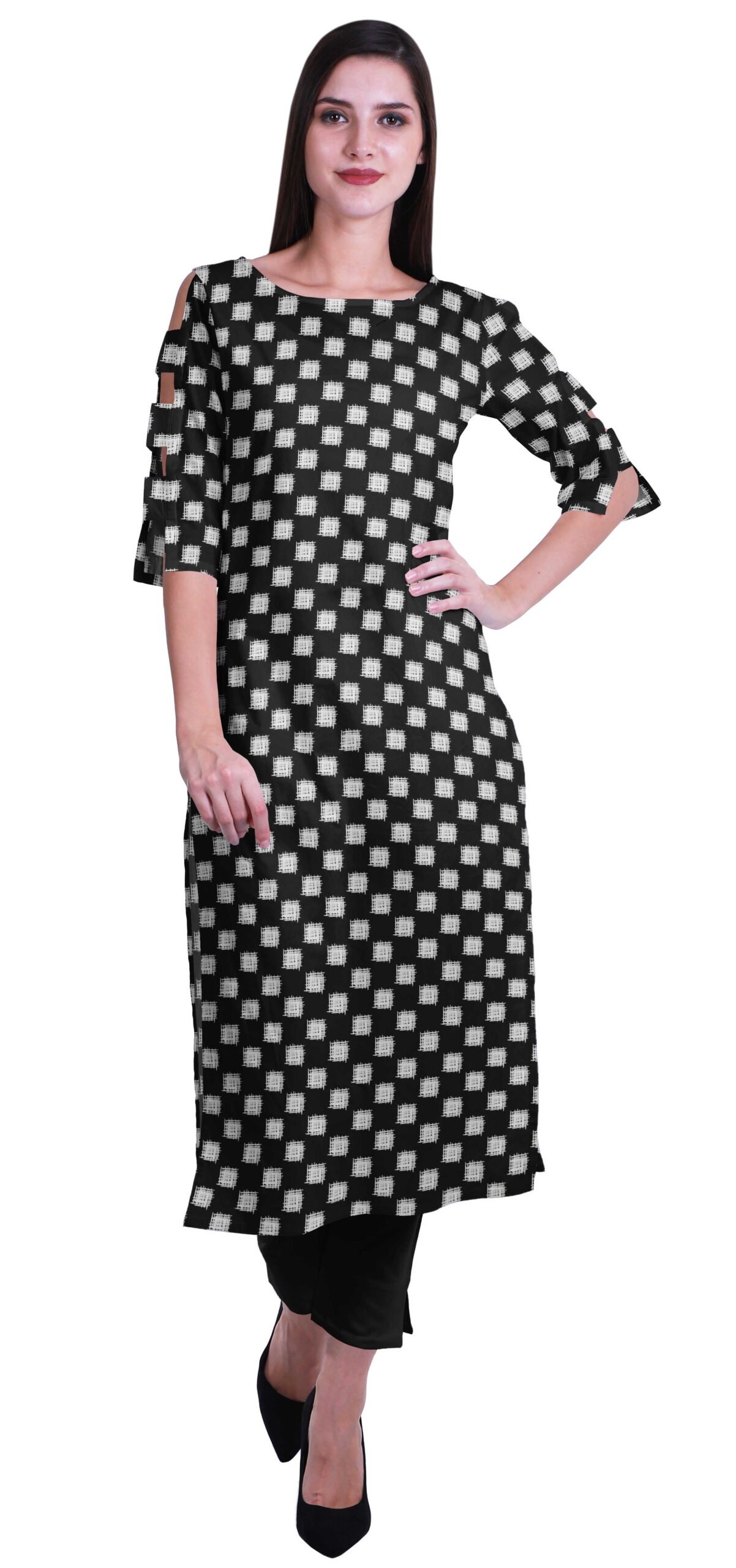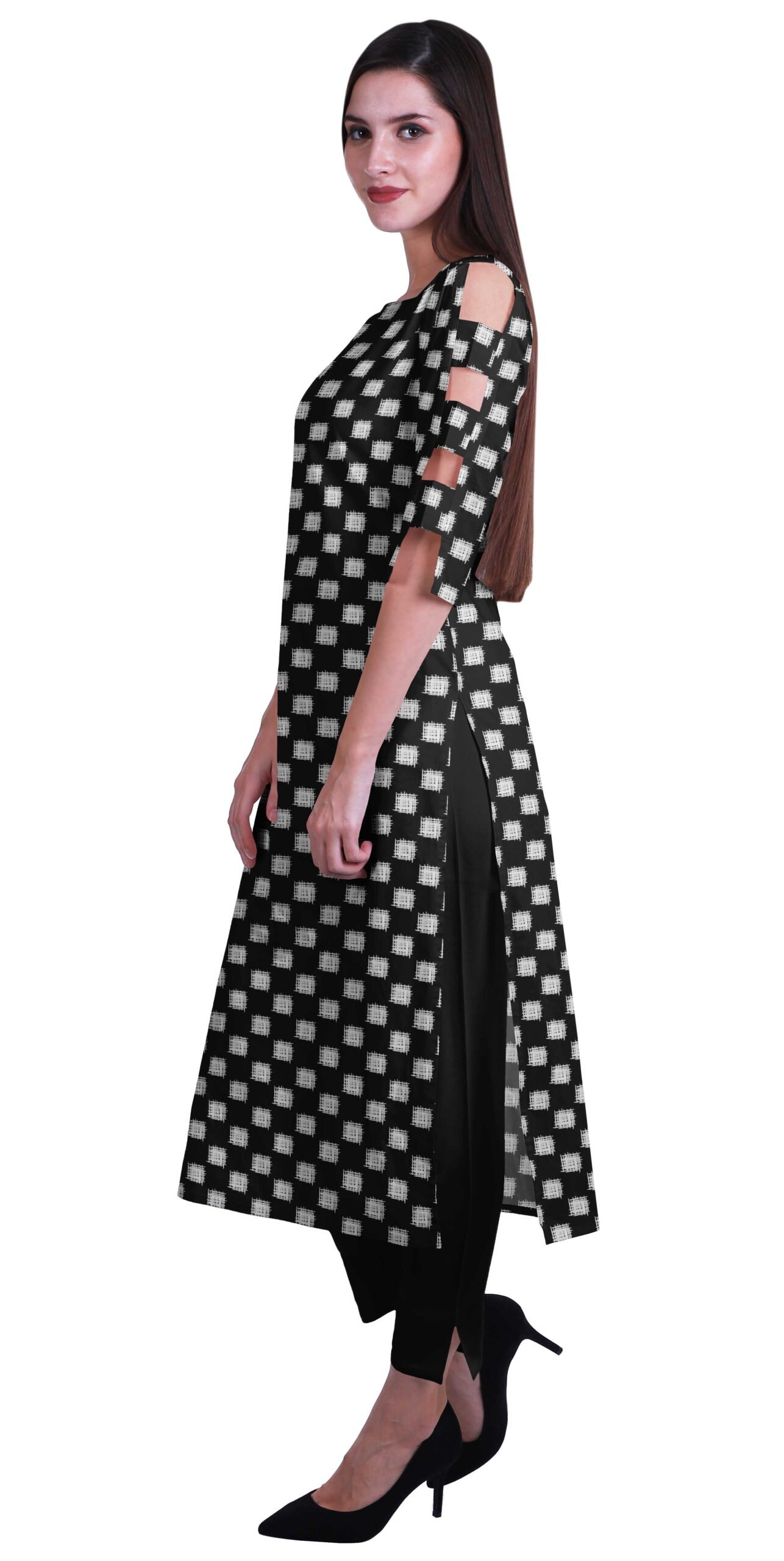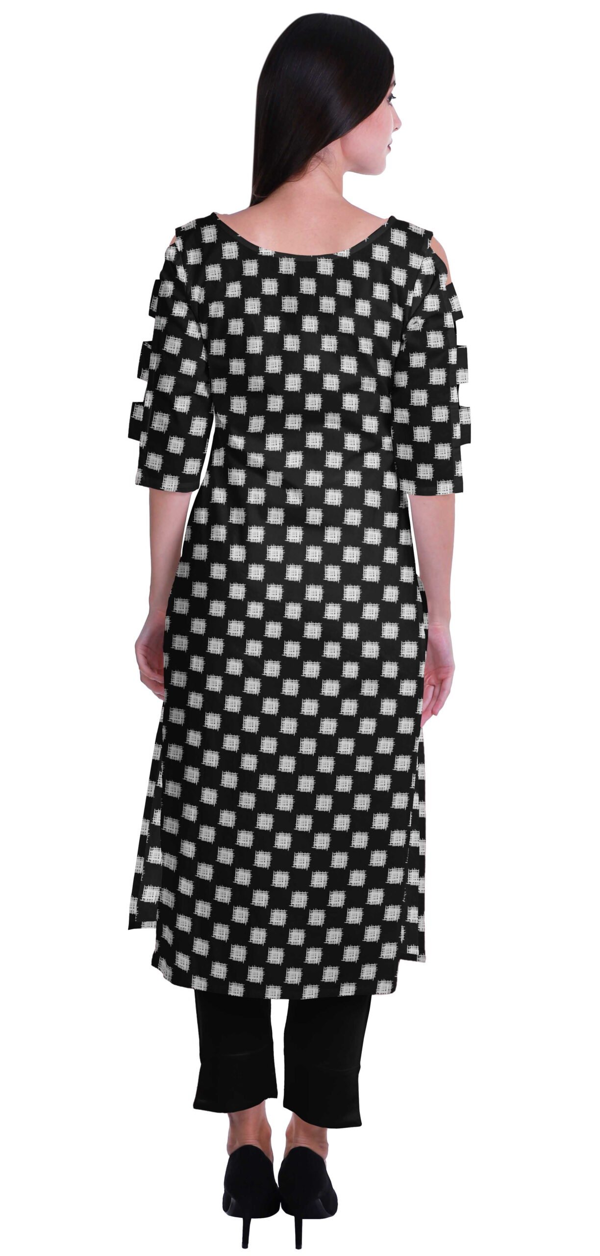 • Features: Long straight kurta with all over prints, boat neck, 3/4th cut sleeves, a straight hem, and solid elastic waist cigarette pant with both side slits.