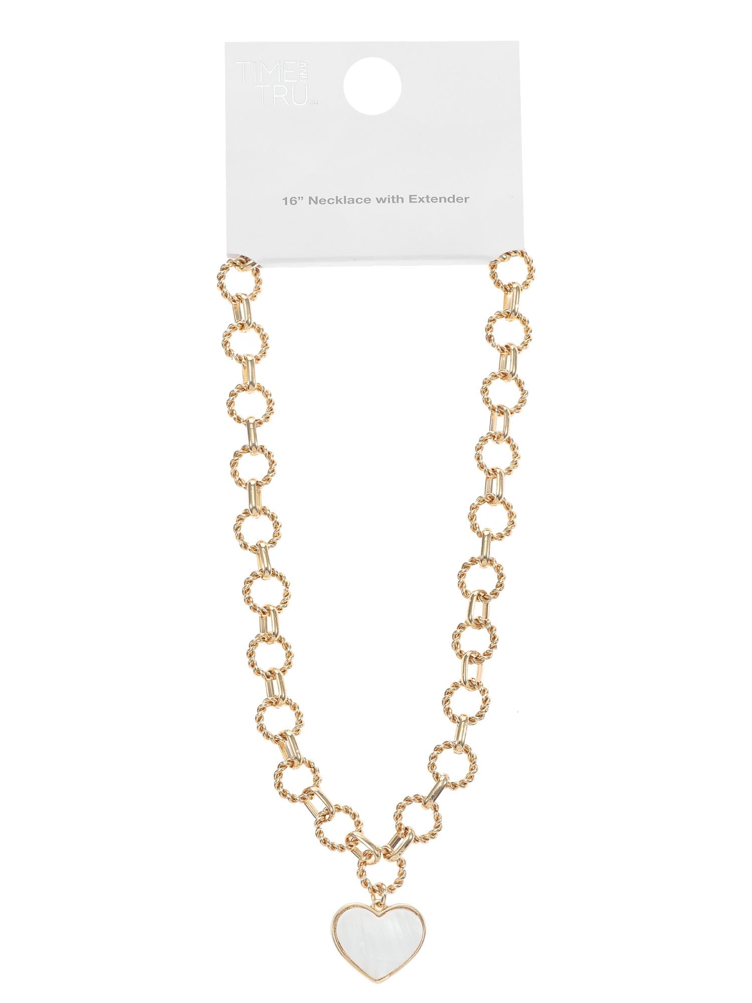 Bring a fun, flirty vibe to your everyday look with this on-trend necklace from Time and Tru. This pretty necklace features an ivory heart pendant on a twisted, open-link chain. This oh-so-versatile style looks great with most necklines and is great for dressing up a pair of casual jeans, or adding the finishing touch to your favorite outfit. The ivory pendant is simulated Mother of Pearl on gold-tone metal and approximately 1″ diameter. The always-popular heart motif makes this necklace a great gift for anyone with on-trend style and a modern or classic look – girlfriend, wife, sister, daughter or mother.