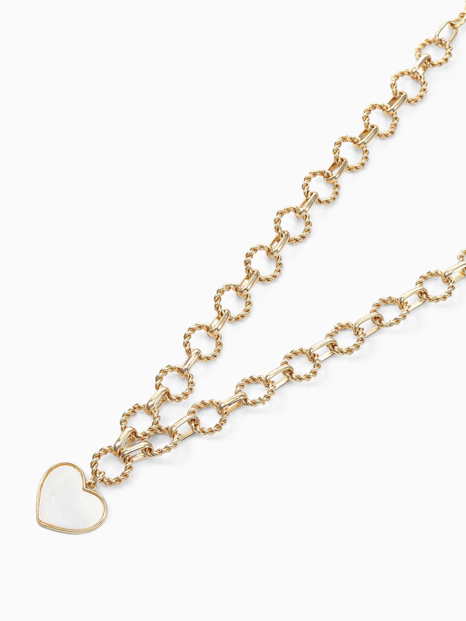 - Accents: Chunky gold-tone chain, with simulated Mother of Pearl heart pendant