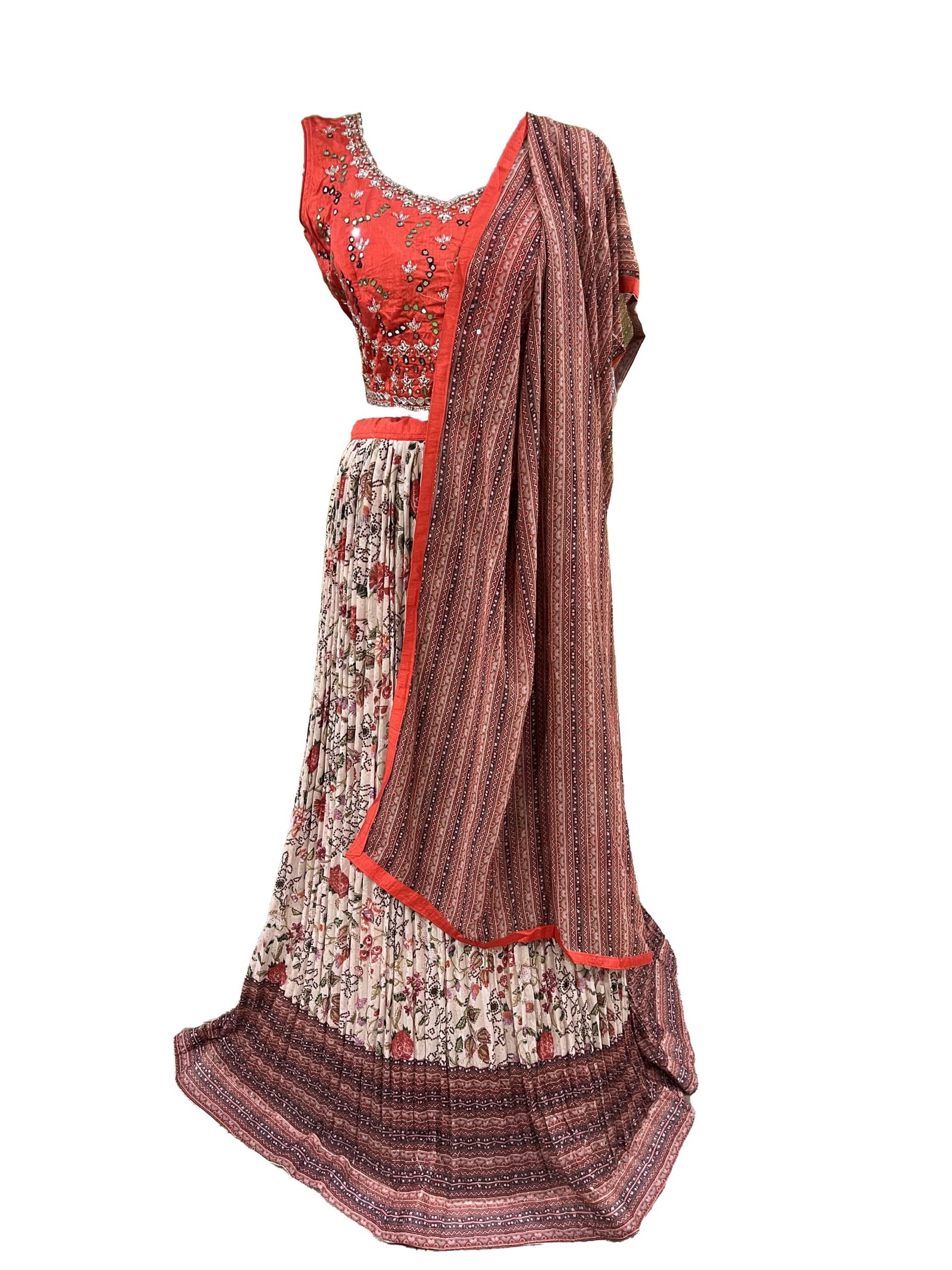 - 3-piece traditional lehenga set: Includes embroidered blouse (choli), floral skirt, and matching dupatta